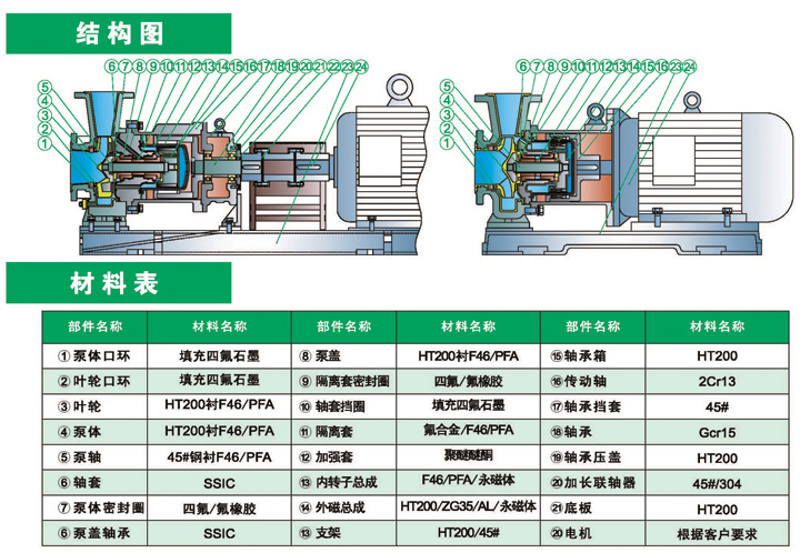 2. 泵體采用鑄鐵內(nèi)襯氟塑料(PTFE、FEP、PFA)整體燒結(jié)壓制而成,內(nèi)轉(zhuǎn)子、泵蓋、葉輪、隔離套等過(guò)流部件采用金屬嵌件外包氟塑料(PTFE、FEP、PFA)整體燒結(jié)壓制而成;