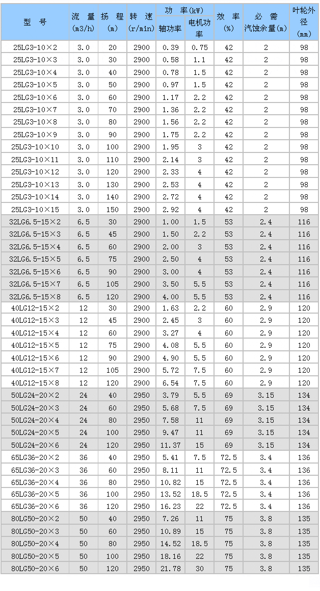 四、LG型高層建筑多級給水泵技術(shù)參數(shù):